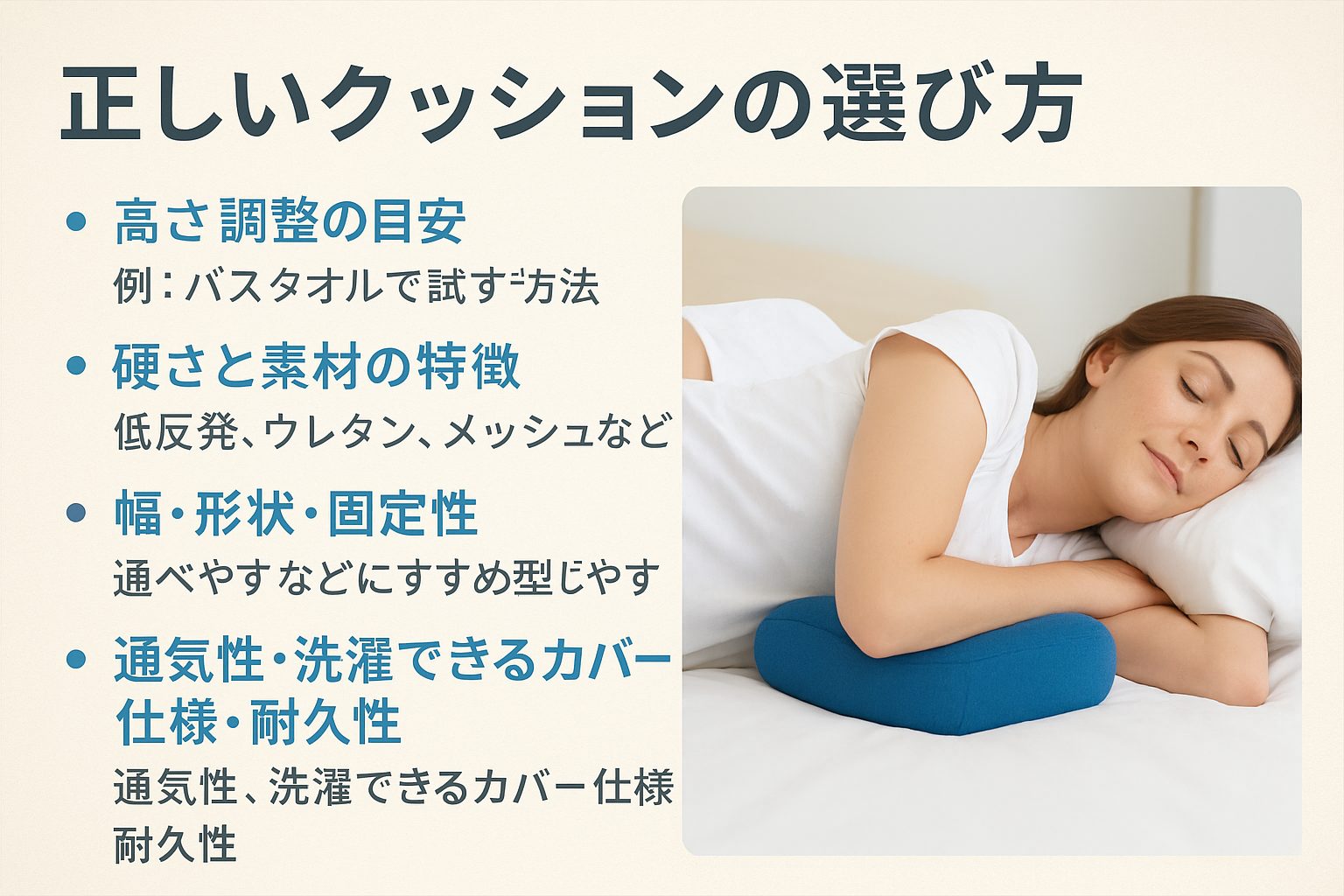 クッションが高すぎたり幅広すぎたりすると、寝返りを妨げるリスクがあると指摘されています。寝返りは睡眠中に血流を保ち、体のこわばりを防ぐために必要な動作だと言われています。そのため、腰や膝の下に置く場合でも、寝返りの自然な動きを邪魔しないサイズ感を選ぶことが重要です。小さな工夫で快適さが変わるので、まずはタオルや小ぶりのクッションで試す方法も推奨されています。