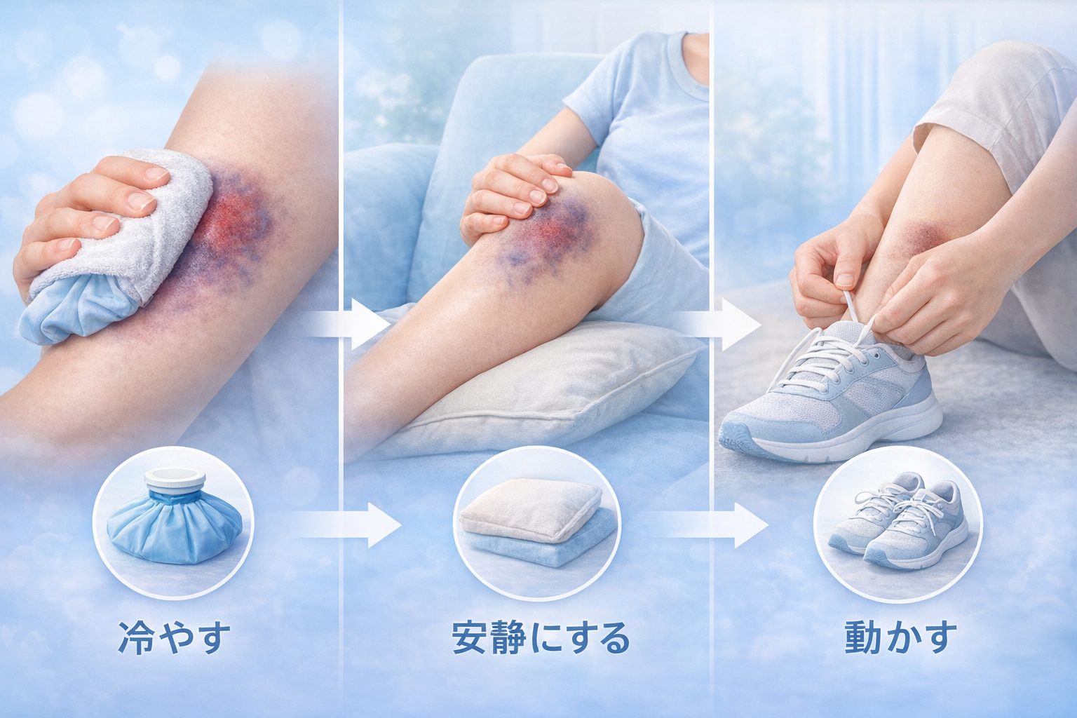 あざができた直後は、「このまま放っておいて大丈夫?」「何かしたほうがいいの?」と迷う方も多いはずです。実際、初期の過ごし方によって、その後の痛みや腫れの出方が変わるケースもあると言われています。ここでは、一般的に知られているセルフケアと初期対応の考え方を整理します。