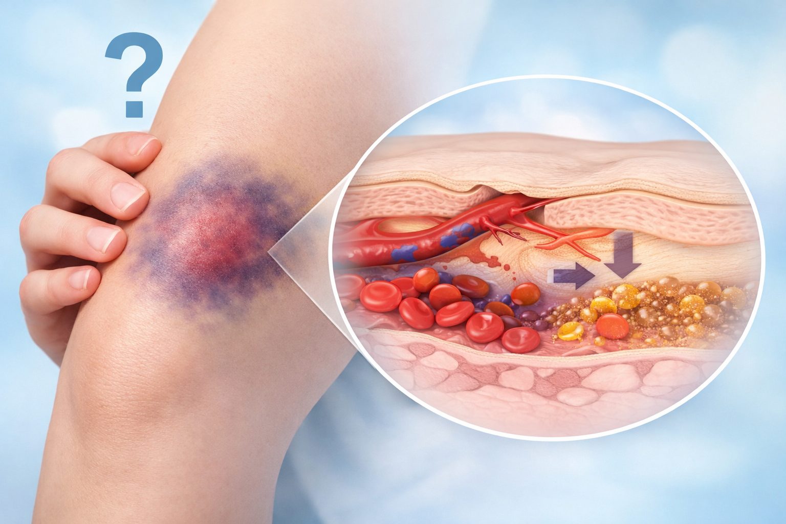 その後、「あざの色」が変わっていく理由は、血液中のヘモグロビンが体内で少しずつ分解・吸収されていくためだと言われています。最初は酸素を多く含んだ血液の色が目立ち、時間の経過とともに分解産物へと姿を変えていく──この流れが、色の変化として目に見えて現れるわけです。