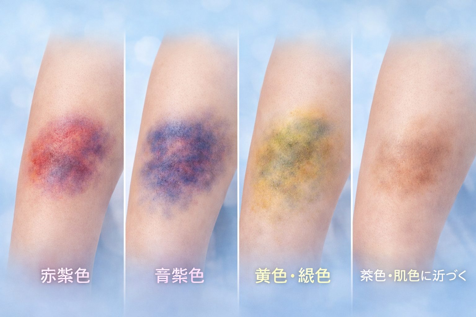 あざは、発生直後から少しずつ色を変えながら改善へ向かうケースが多いとされています。