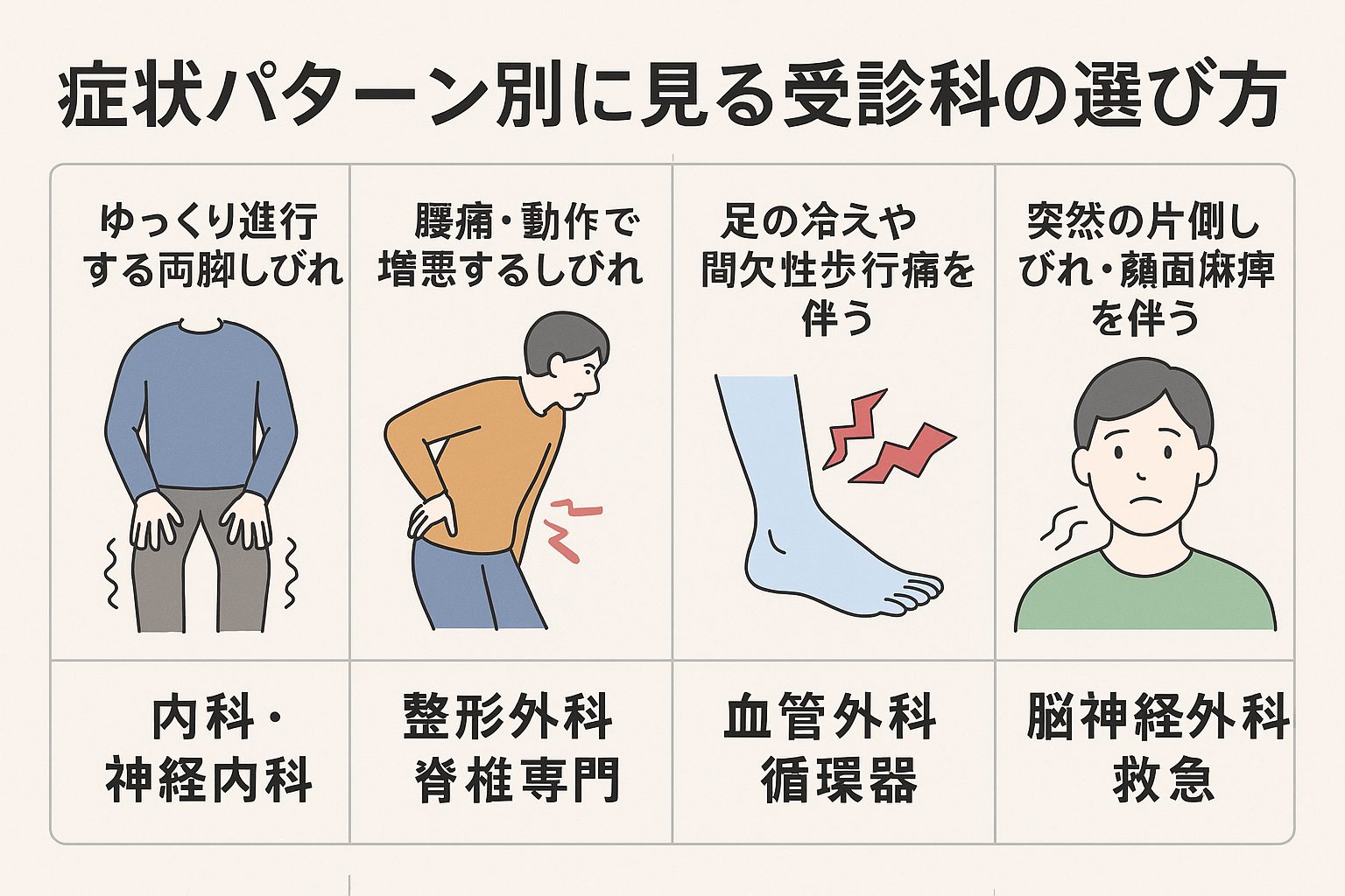 2. 症状パターン別に見る受診科の選び方2-1. ゆっくり進行する両脚しびれ → 内科・神経内科