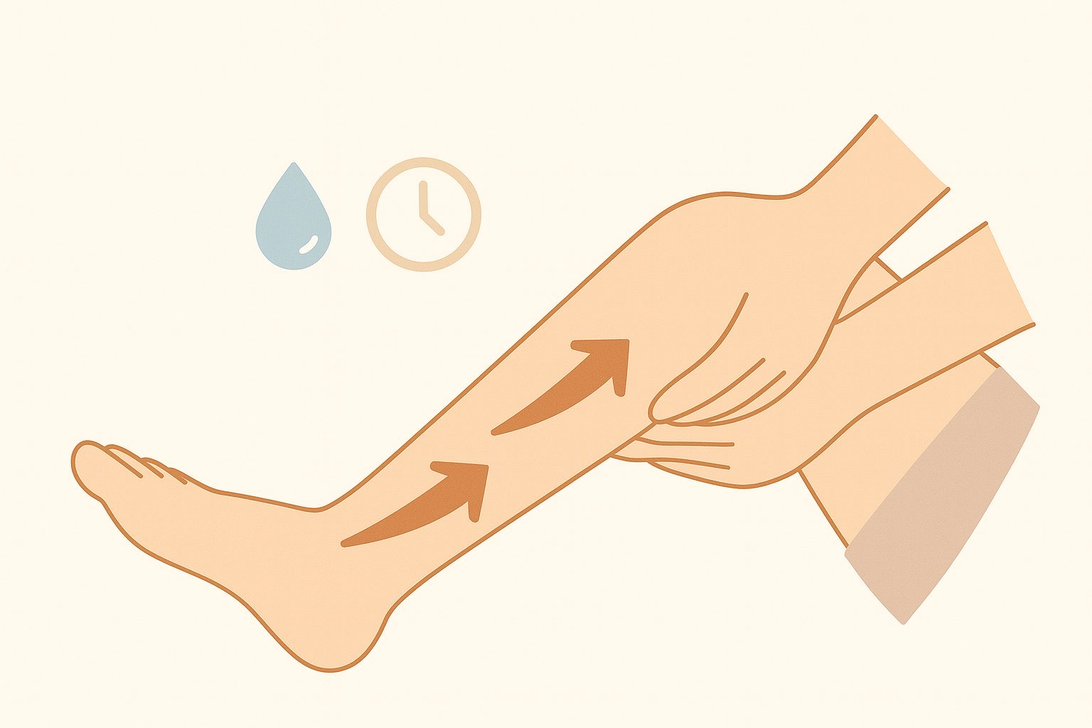 足首からふくらはぎ、さらにそけい部に向かってやさしくなで上げるようにマッサージすると、リンパの流れを助けやすいと言われています。強く押すのではなく、手のひら全体で軽く包み込むように行うのがポイントです(引用元:MTG ONLINESHOP西梅田 静脈瘤・痛みのクリニック)。