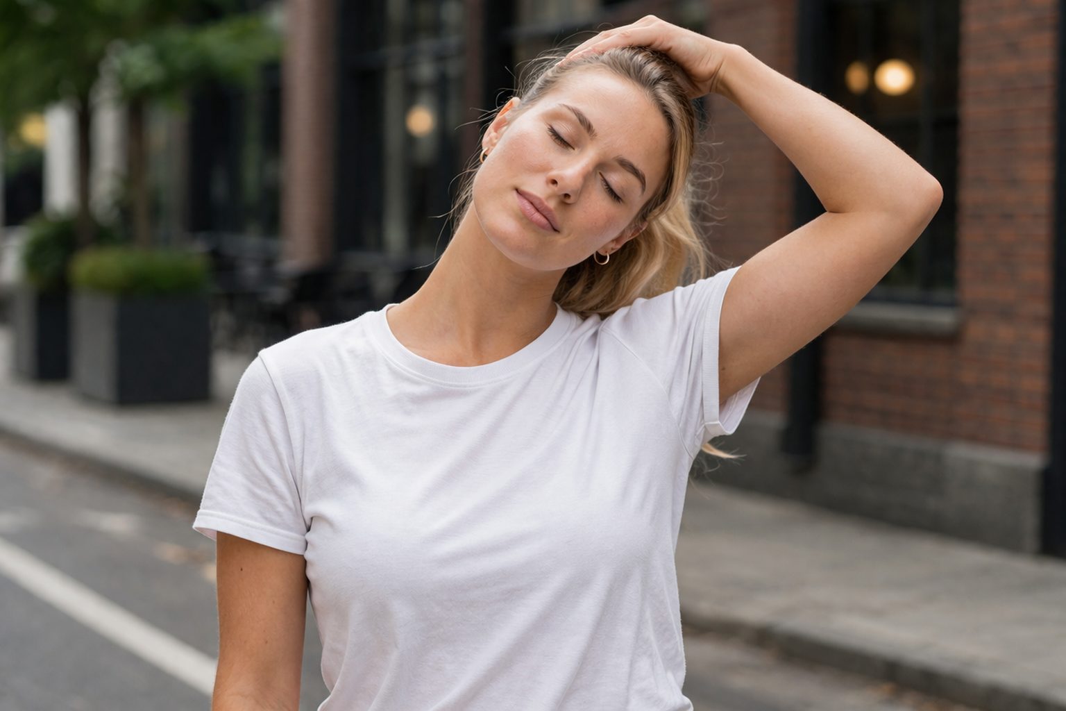 最後に、片手で軽く首を引いてストレッチする方法です。座ったり立ったりした状態で、右手を頭の上に置き、左手を軽く下に引いて首を引っ張ります。この時、首の後ろ側をじわじわと伸ばすことができる感覚を意識してください。肩をリラックスさせ、あまり力を入れすぎないようにしましょう。この方法は後頭下筋群のストレッチに非常に効果的で、肩こりや首こりを予防する助けになります。左右交互に行い、1セットを30秒ほど続けると良いでしょう。