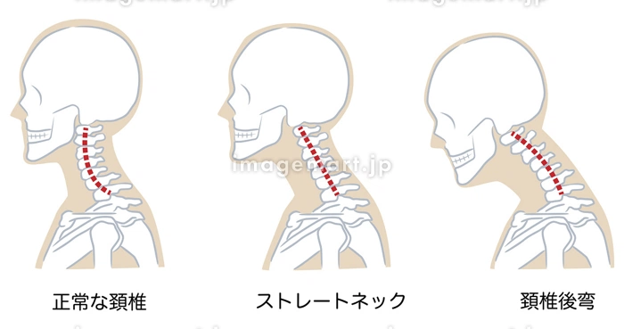 そもそも人間の首(頸椎)は、横から見るとやや前弯(前にカーブ)しています。このカーブが衝撃を和らげたり、頭の重さを支えたりする役割があるのですが、スマホっ首になるとそのカーブが消失してフラット(真っすぐ)になってしまうと言われています。