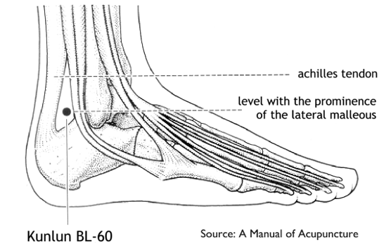 崑崙は足首の外くるぶしとアキレス腱の間に位置します。ふくらはぎ下部から足に伸びる神経ライン上にあるため、足まで響くような違和感があるケースで紹介されることが多いツボです。立っていると足がだるい、かかと側が重いといったタイプの坐骨神経痛で使われると説明されています。