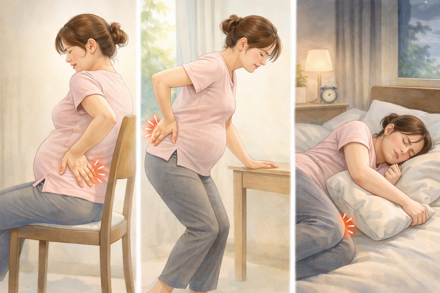 妊娠末期は骨盤周囲の関節がゆるみやすい時期とされており、座位から立位へ切り替わる動作で、尾てい骨まわりに一時的な負荷がかかることがあると考えられています。