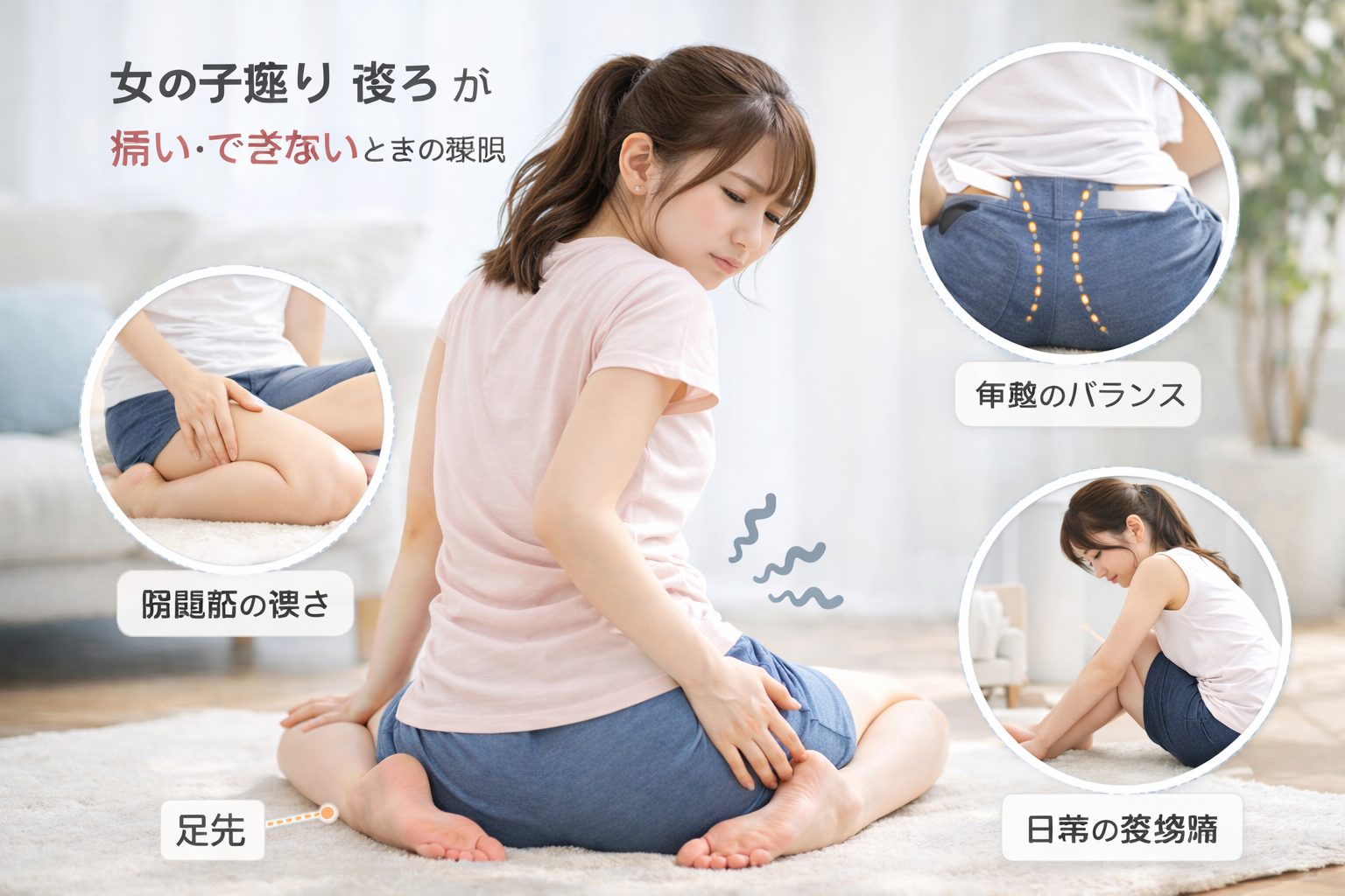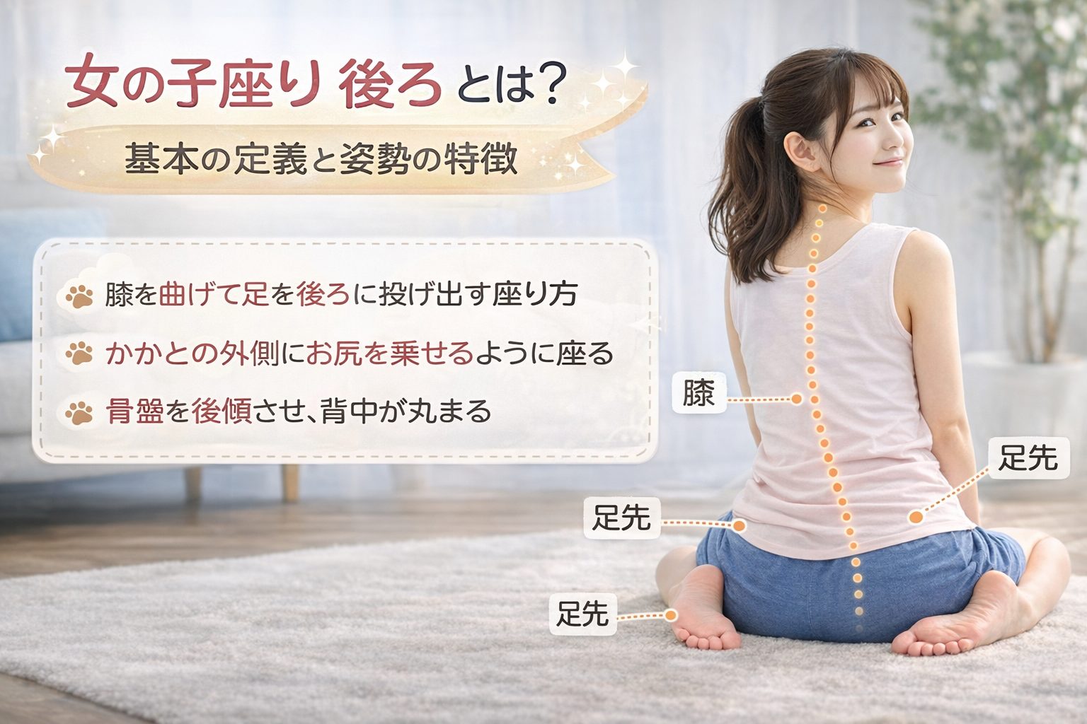女の子座りとは、床に座ったときにお尻を床につけ、両脚を左右に流すように折り曲げる座り方を指すことが多い姿勢です。特に“後ろ”と表現される場合は、背中や骨盤が後方に倒れやすい状態を含めて検索されている傾向があります。