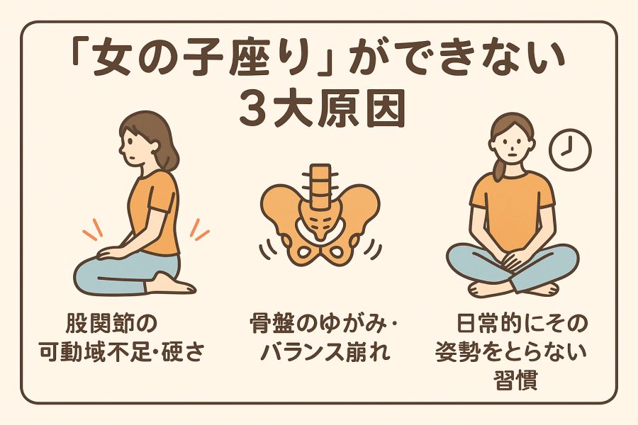 まず代表的なのは、**股関節の可動域(特に内旋・外旋のバランス)**です。女子座りは膝を内側に寄せ、足を外に流す独特の形になるため、股関節の動きが偏っていると座りにくく感じると言われています。たとえば、太ももの付け根が外へ開きづらいタイプの人は、この座り方がどうしても窮屈に感じることがあるようです。