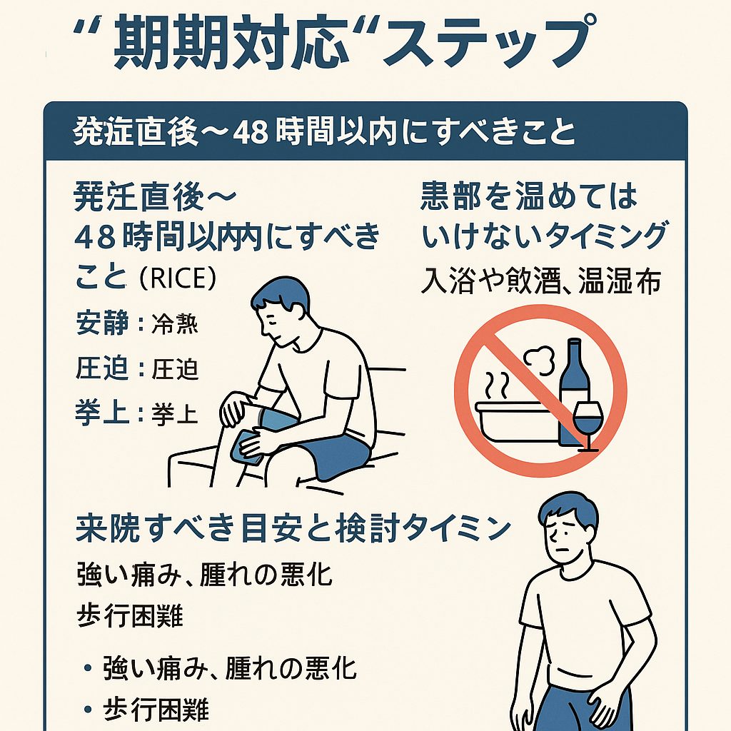 発症直後〜48時間以内にやるべきこと:安静・冷却・圧迫・挙上(RICE処置)