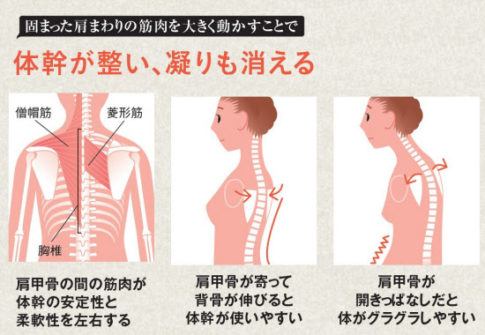 → 強く伸ばす必要はなく、痛みが出ない範囲で肩甲骨まわりをゆっくり動かす程度がよいと言われています。無理に我慢して動かすと、かえって違和感が増すケースもあるようなので注意が必要です。