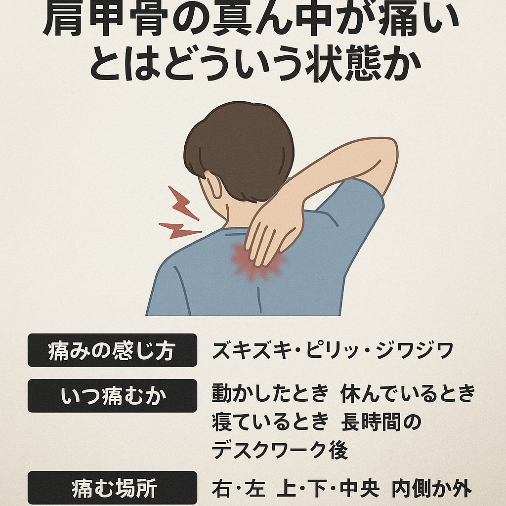 「肩甲骨の真ん中」といっても範囲は広く、左右のどちらかに偏る場合や、上下・中央といった位置の違いでも原因が異なることがあります。さらに内側寄りなのか外側寄りなのかで関係する筋肉や関節も変わると考えられています。そのため、位置の把握は原因を推測するうえで大切なポイントとされています(引用元:alinamin.jp)。