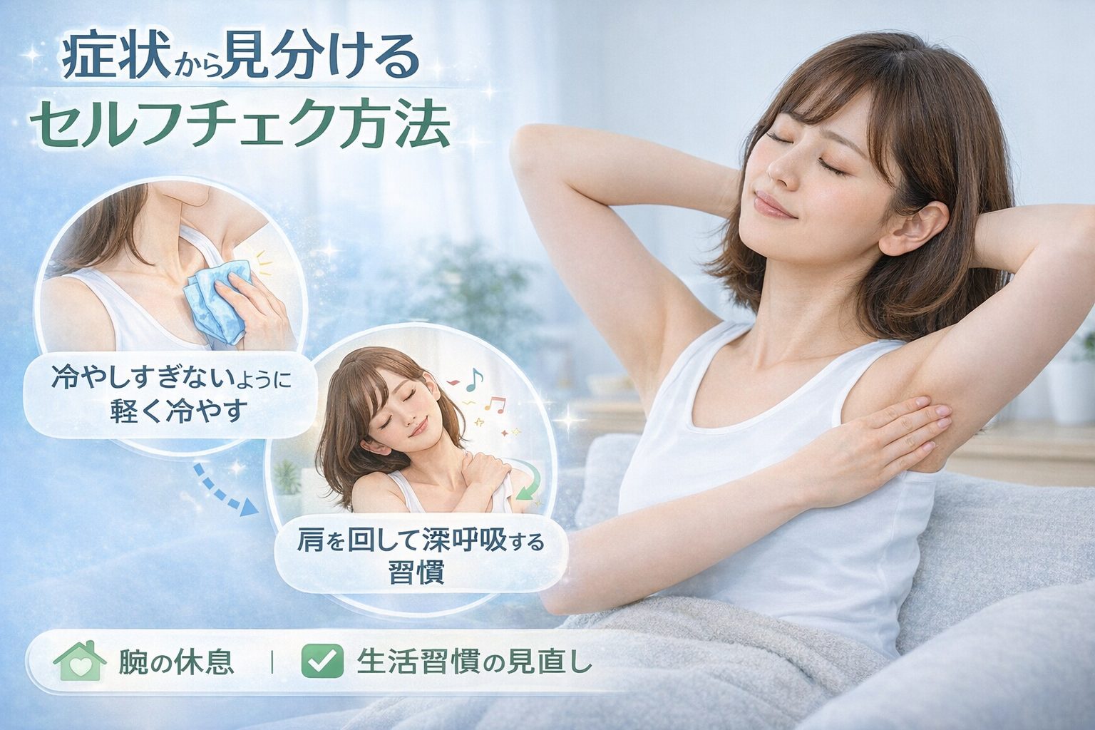 痛みや熱っぽさを感じるときは、腕を少し休ませ、楽な姿勢で過ごすことが基本とされています。冷却については、違和感が強い初期に短時間行うと楽に感じる方もいるようですが、冷やしすぎには注意が必要です。