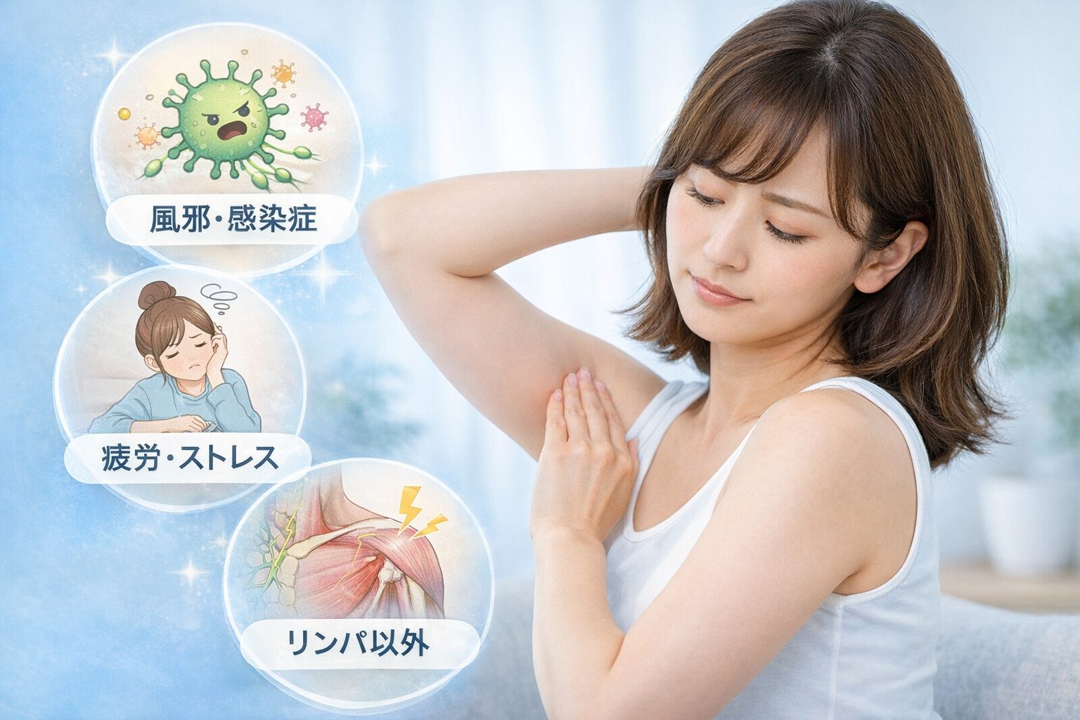 そう感じる方は少なくありません。腕の付け根(脇の下)のリンパ節が反応する背景には、いくつかの代表的な要因があると言われています。ここでは、よく見られる原因を整理して見ていきましょう。