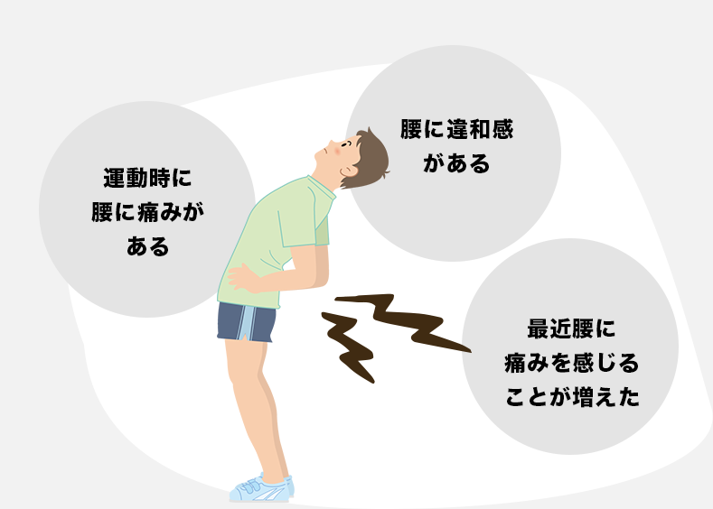 代表的なのは、運動時や運動後の腰痛です。さらに、体を反らすと痛む、長時間立つとつらい、といった変化がみられることもあります。反対に、安静にしていると楽になる傾向があるとも言われています。