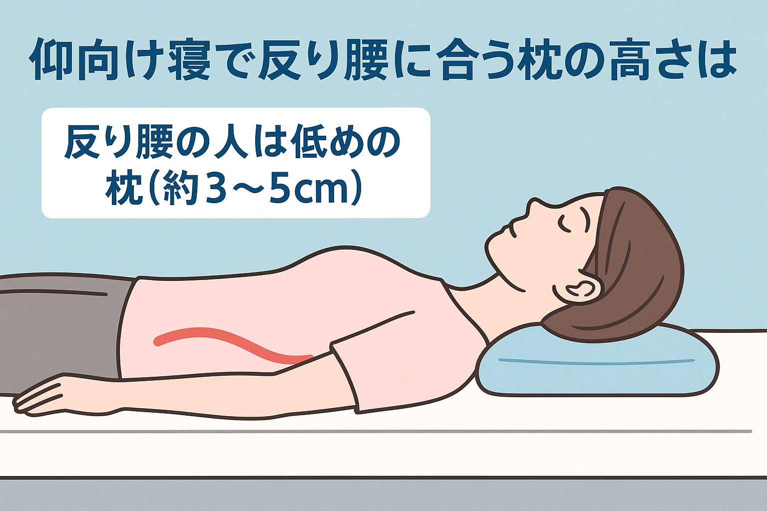 仰向け寝の場合、反り腰の人には「低めの枕(おおよそ3〜5cm前後)」が合いやすいと言われています。