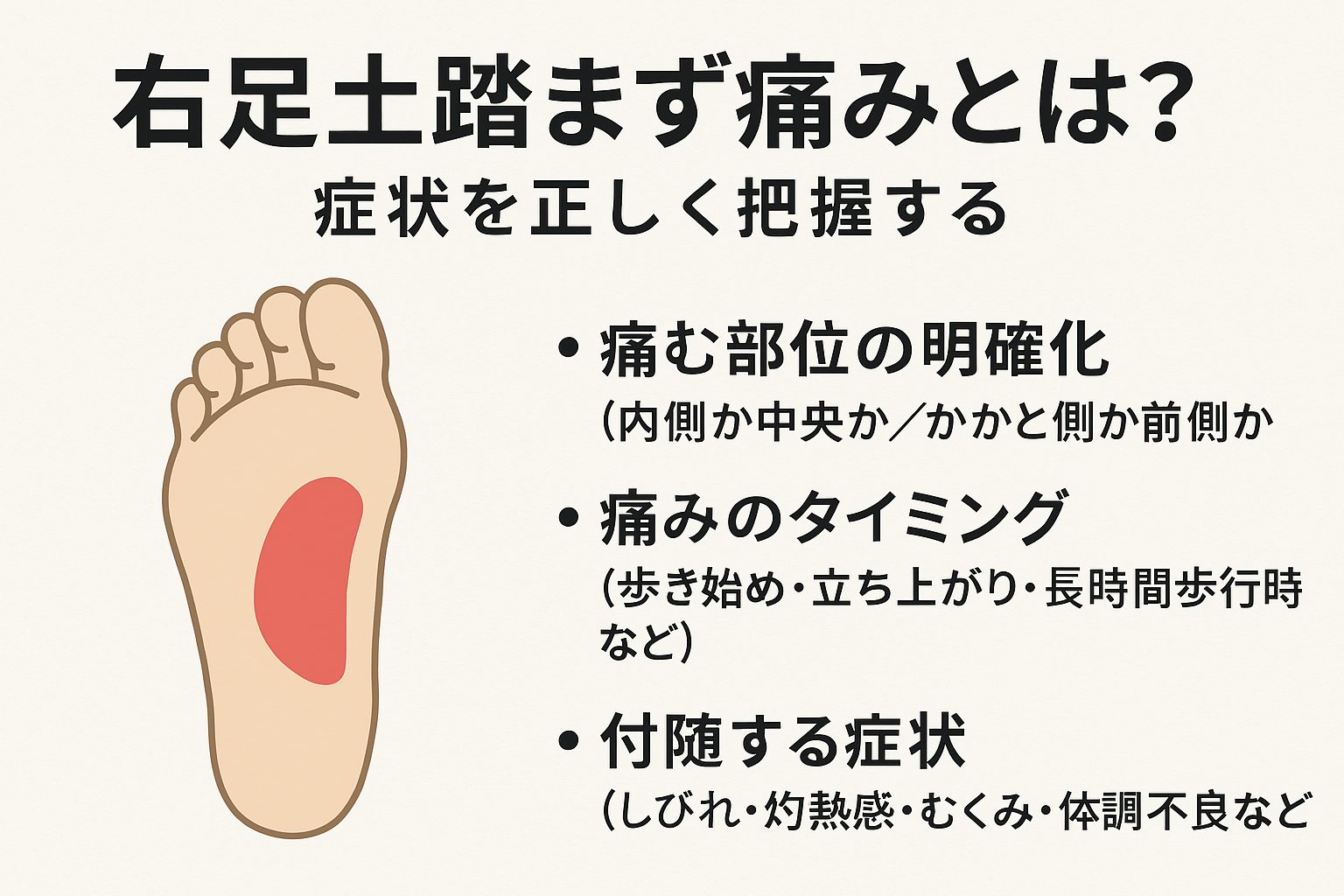 1. 右足土踏まず痛みとは? — 症状を正しく把握する– 痛む部位の明確化(内側か中央か/かかと側か前側か)