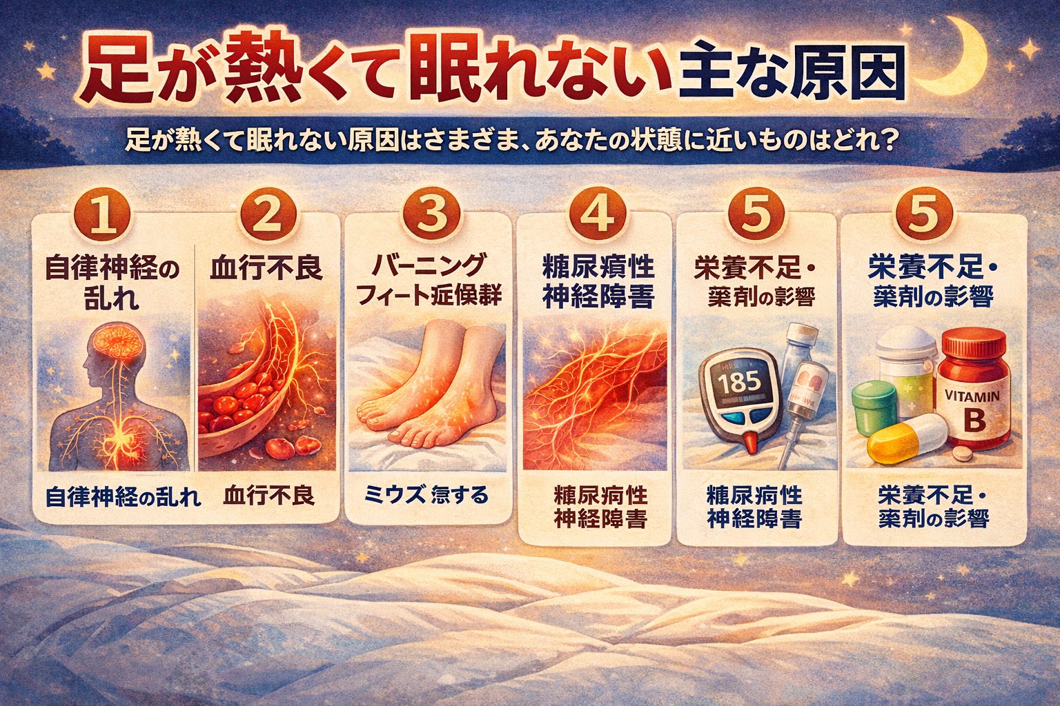 足が熱くて眠れないと、「何か大きな病気かな…?」と心配になる方もいるかもしれません。でも、原因は1つだけではなく、複数の要因が絡み合っている場合もあると言われています。ここでは、特に意外と見落とされがちな ⑤ その他の可能性(栄養不足・薬剤など) について、どうして夜に足が熱く感じやすくなるのかを分かりやすく説明します。