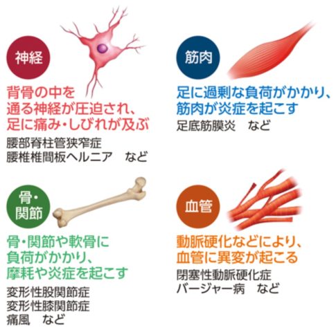 「足が痛い」と一言で言っても、中身は一つじゃないんです。大きく分けると、原因は4つに整理できると言われています。