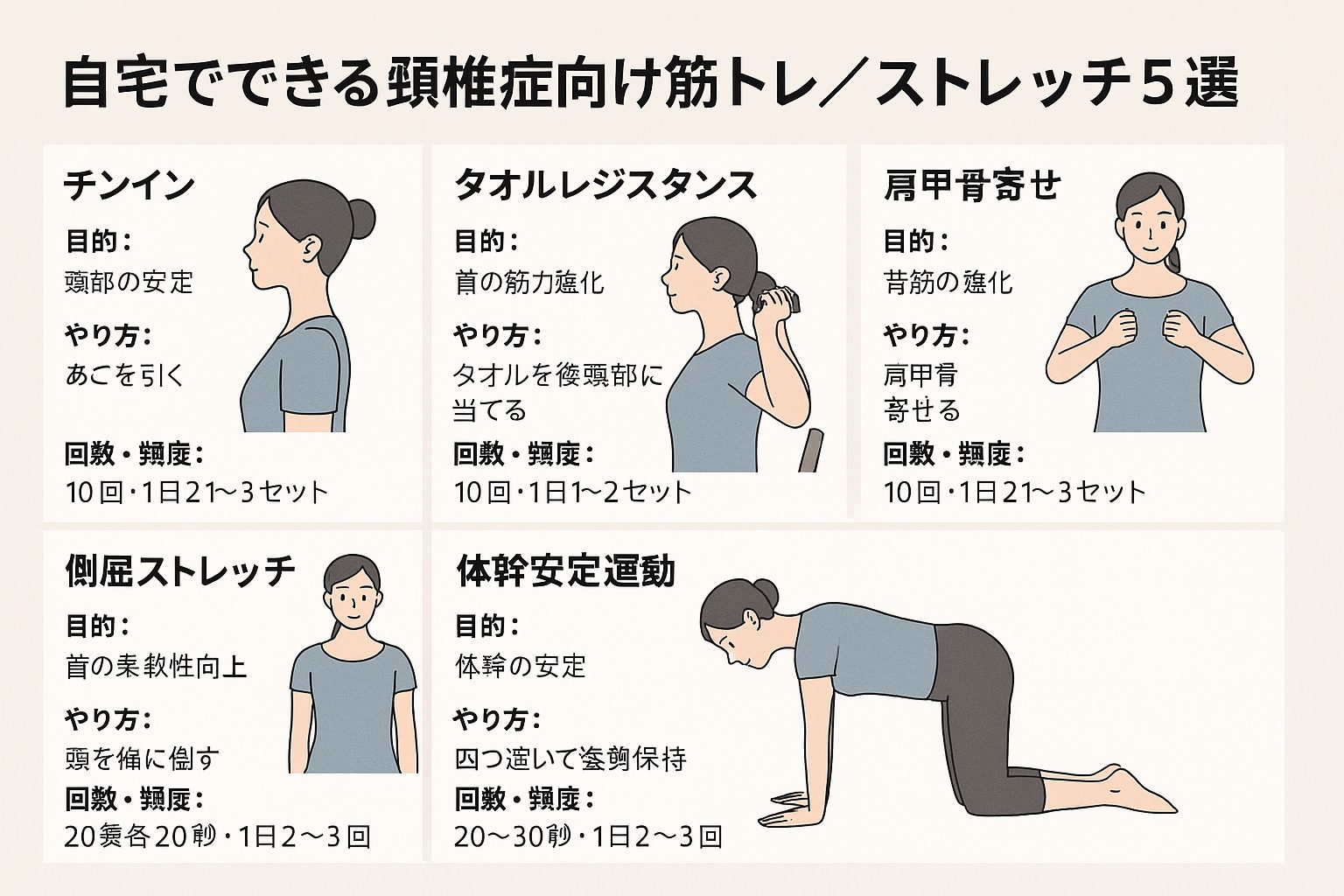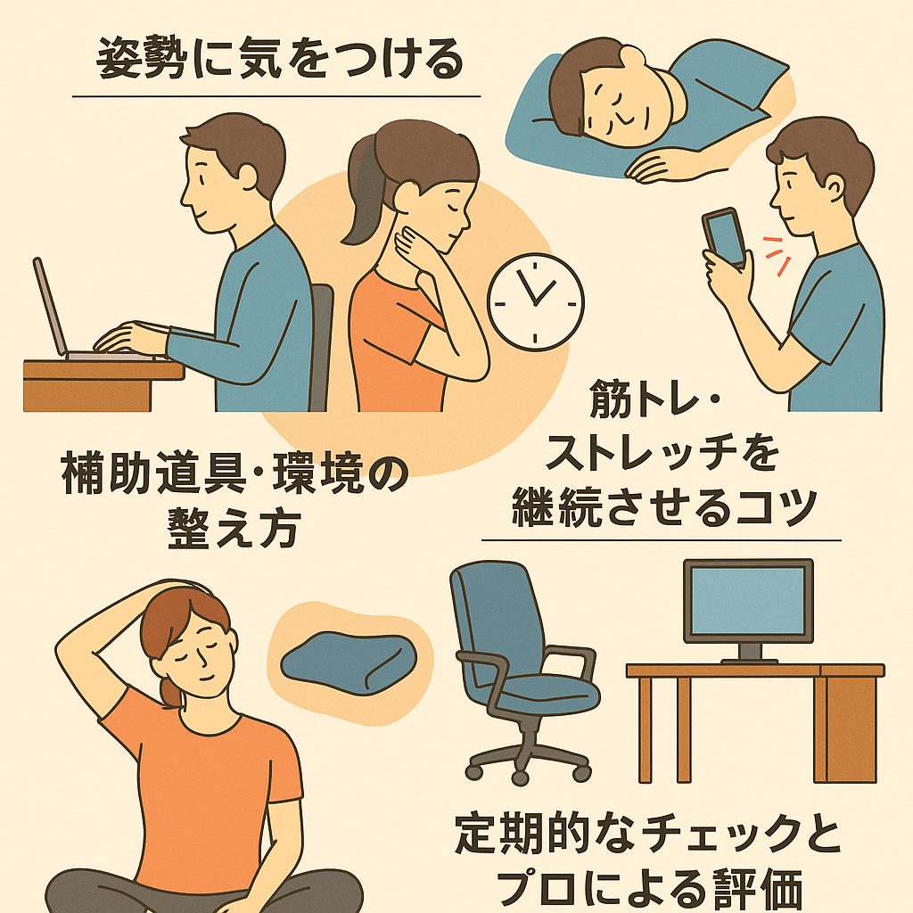 例:チンイン(あご引き運動)、タオルレジスタンス、肩甲骨寄せ、側屈ストレッチ、体幹安定運動、深層首筋トレーニング、胸筋ストレッチ など