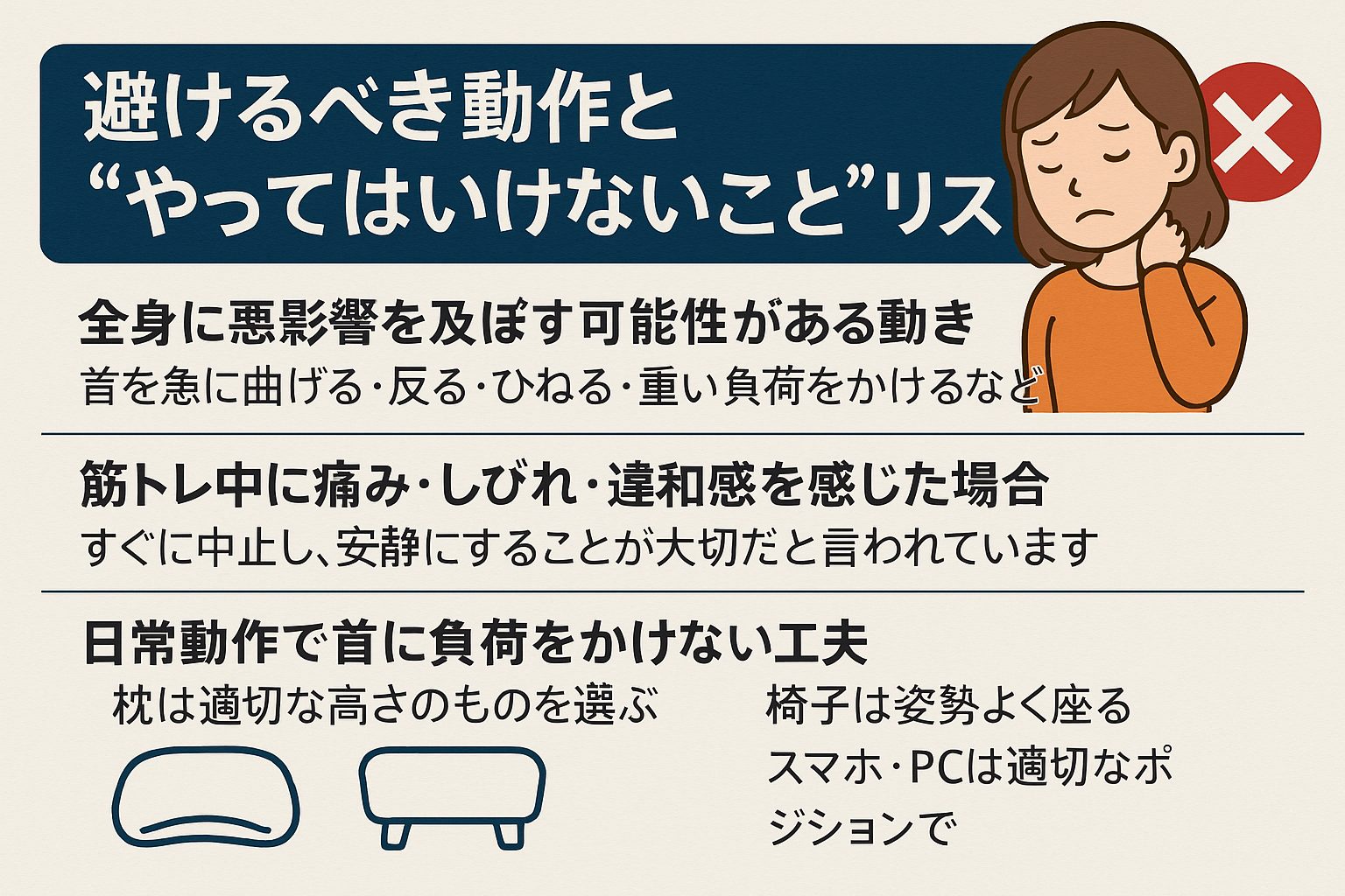 全身に悪影響を及ぼす可能性のある動き:首を急に曲げる/反る/ひねる/重い負荷をかけるなど