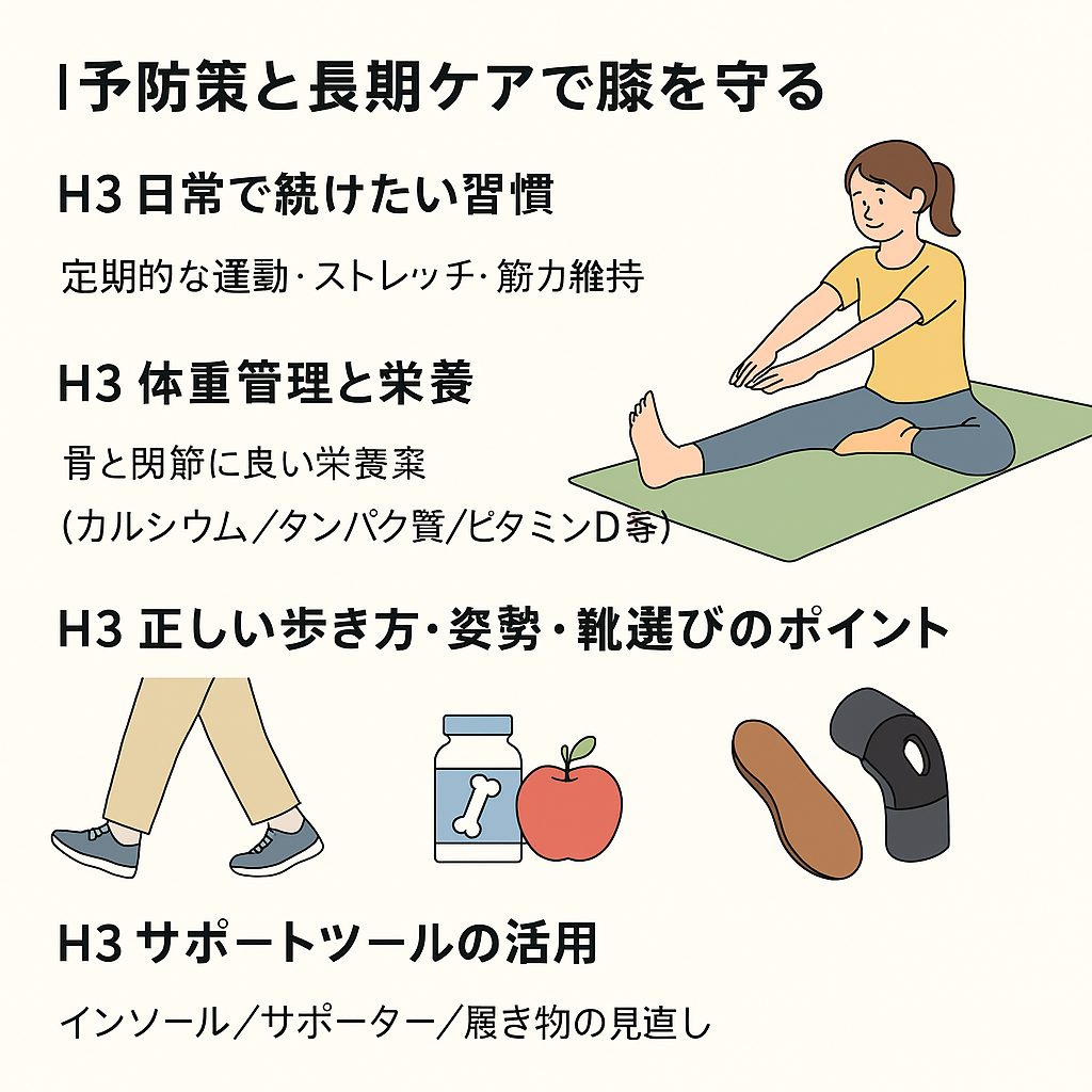 膝の予防と長期的なケアは、一度に大きく取り組むのではなく、日常の小さな習慣の積み重ねによって実現できると考えられています。