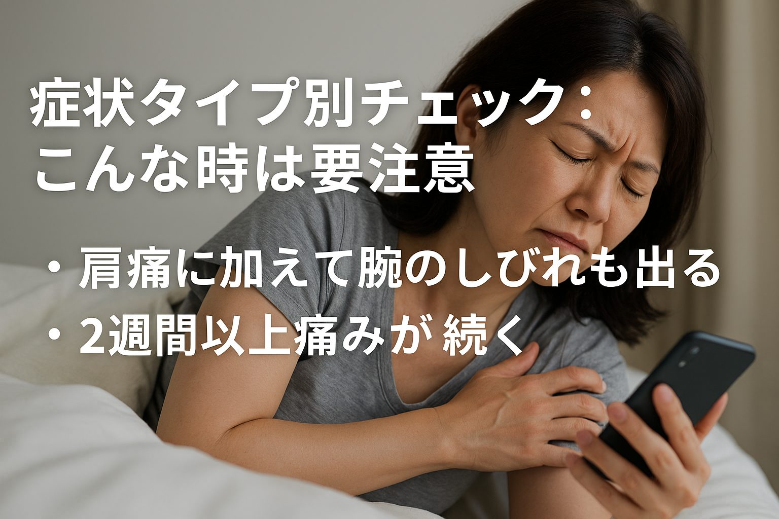 – うつ伏せでの肩関節後方への突き上げ圧などの具体例 - 「症状タイプ別チェック:こんな時は要注意」– 肩痛に加えて出る可能性のある症状(しびれ、可動域制限、腕のだるさなど)