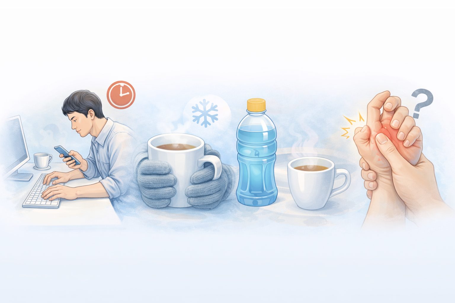 さらに、冷えや血行不良も見逃せません。指先は心臓から遠く、血流の影響を受けやすい部位です。冷房環境や冬場などで血流が滞ると、筋肉が硬くなり、つりにつながることがあると言われています。