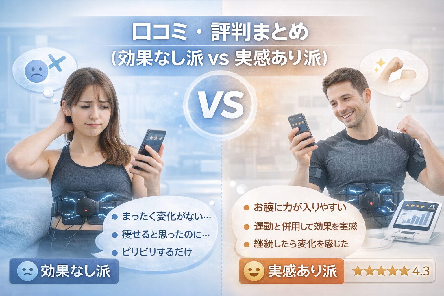EMSについて調べていると、口コミの意見が真っ二つに分かれていることに気づくはずです。**「emsトレーニング 効果ない」**と感じた人がいる一方で、「思ったより良かった」「体の変化を感じた」という声も見られます。ここでは、両方の意見を整理してみましょう。